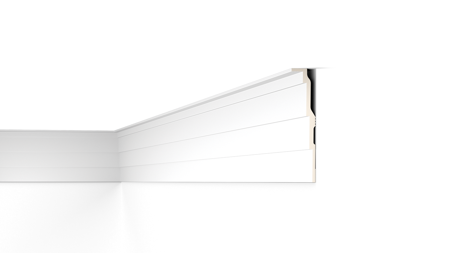 Mit direkter oder indirekter Beleuchtung kombinierbare Decken-, Wand- und Sockelleisten sowie Wanddekoraktionselemente.
