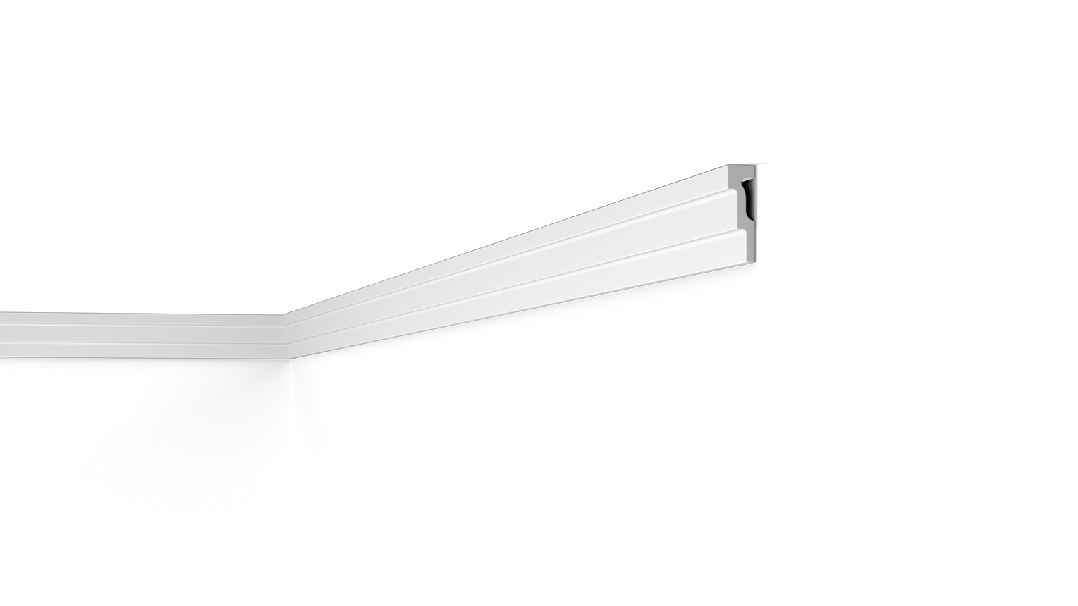 Mit direkter oder indirekter Beleuchtung kombinierbare Decken-, Wand- und Sockelleisten sowie Wanddekoraktionselemente.