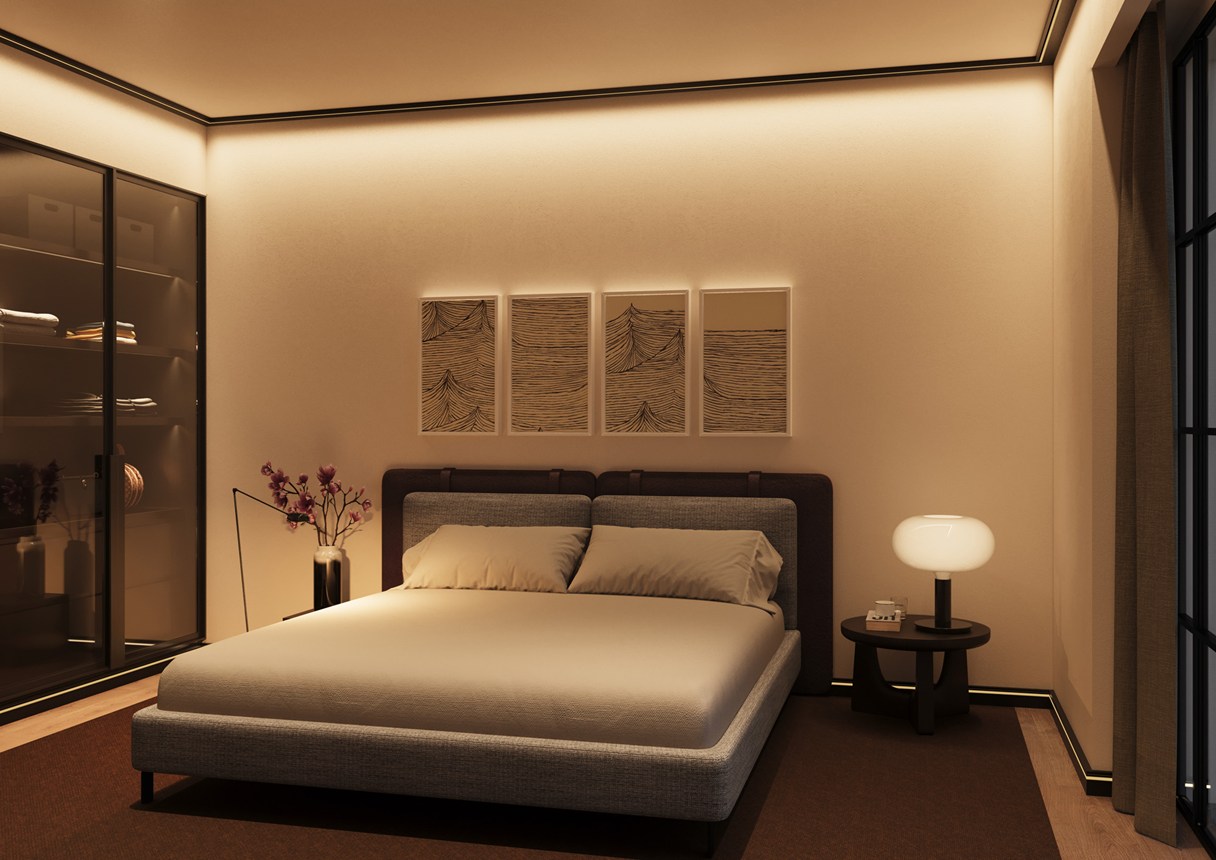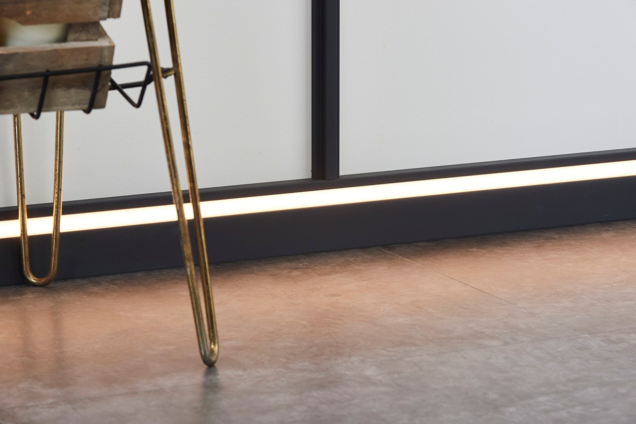 Les plinthes avec éclairage indirect diffusent une lumière douce et flottante dans les espaces, agrandissant visuellement les pièces et allégeant les surfaces. Ce halo délicat met en valeur les caractéristiques architecturales et atténue les contrastes marqués, permettant ainsi de créer des intérieurs apaisants et confortables.